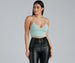 Showcase your chic trendsetter status in this adorable crop top! It features a sleeveless bodice with spaghetti straps that cross in the back. a V-neckline. and a cropped. form-fitting style. Complete your look with the matching cardigan. a plaid mini skirt. and chunky sneaks.